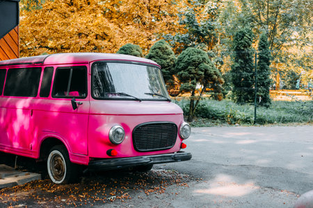 A pink van is parked near a path surrounded by colorful autumn trees. The sun filters through the leaves highlighting the peaceful atmosphere of this quiet park.