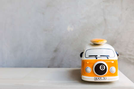 Ceramic bay bus with space on wood background, beach bus, summer holiday concept, transportation and travel concept