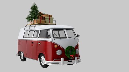 Merry Christmas red Vintage Pickup Truck with christmas gifts and tree on gray background. 3d Rendering