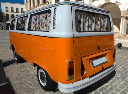A classic orange van parked at High Square of Badajoz, Spain