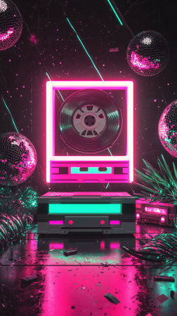 Vibrant photography of a boom box against a neon lights backdrop creating an energetic atmosphere