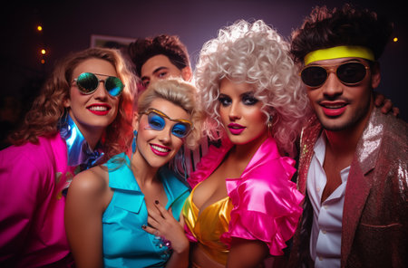 80s Retro Bash: Colorful costumes, neon lights, group of friends dancing to classic hits in nostalgic celebration.