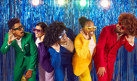 Glam retro group expressing charisma with colorful disco outfits. Concept of 70s inspired fashion, pop culture events, nostalgia lifestyle and vibrant party identity