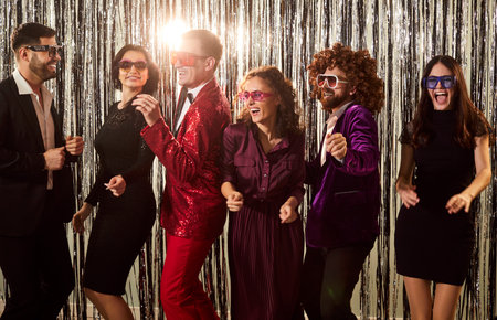 Portrait of happy excited young people group in bright suits enjoying disco corporate party together and having fun on silver sparkle foil background. Dancers in night club. Celebration concept.