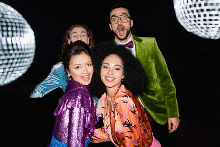 smiling arab man in stylish blazer dancing near multiracial friends in night club on black background