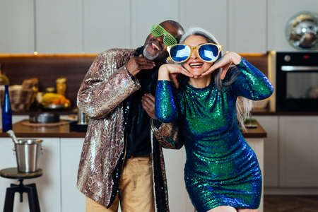 Cinematic image of an happy multiethnic senior couple making party. Indoors Lifestyle moments at home. Concept about seniority and relationships