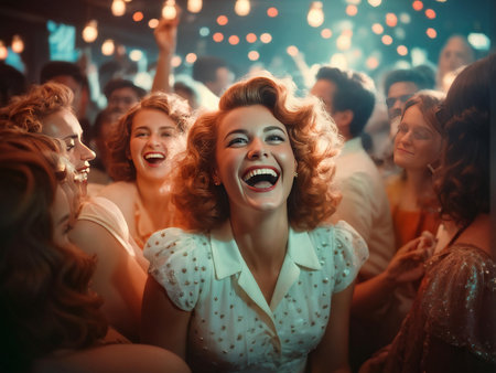Playful young woman dancing with retro fashion group at party. Concept of fun, lifestyle entertainment, youth creativity and cultural celebration.