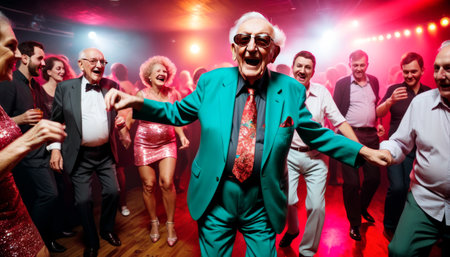 A jubilant elderly gentleman in a teal suit dances joyfully among a lively crowd at a vibrant retro-themed party.. AI Generation
