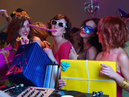 close-up of group of beautiful girls playing with party horns and laughing. with people dancing in teh background