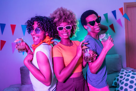 Three happy multi-ethnic friends partying at night with colorful neon light in the house