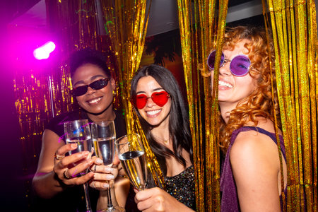 Three multi ethnic female friends are toasting with champagne flutes at a nightclub, enjoying the nightlife and wearing colorful sunglasses