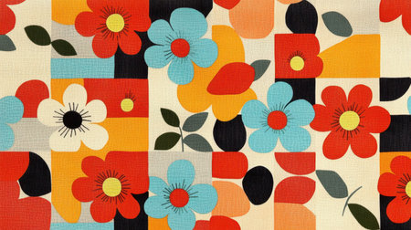 This vibrant floral abstract pattern showcases a mix of bright flowers and geometric shapes, perfect for textiles, home decor, or artistic projects.