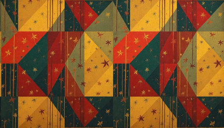 Abstract patchwork quilt pattern with colorful triangles and star shapes