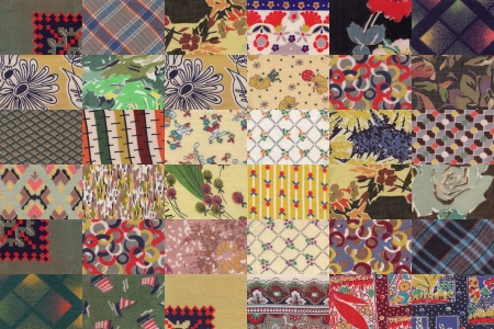 quilt making, assorted fabric patches combined in a quilt square, creating a pleasing mix of colors and patterns with diverse textures