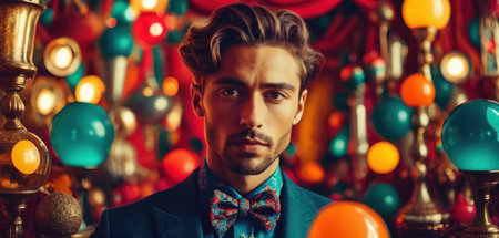 Portrait of a handsome young man in a suit and bow tie looking at the camera while standing in a nightclub with confetti