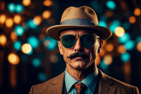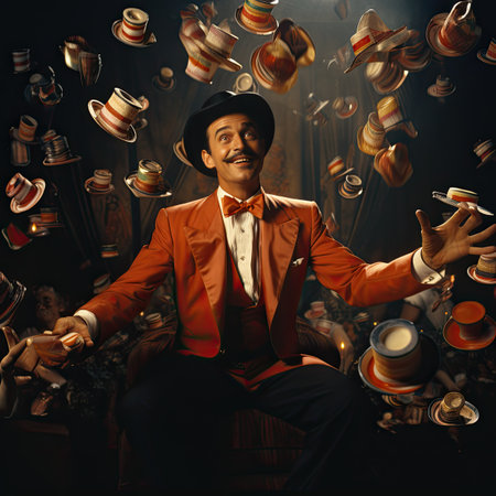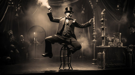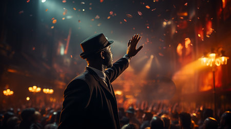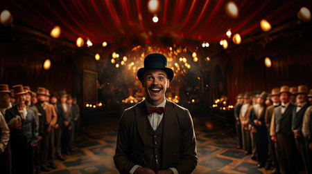 A man wearing a circus costume with a top hat on the background of lights in the circus. generative ai.