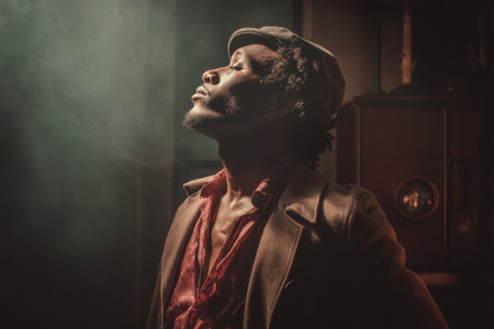 A man in a hat and open shirt basks in warm light, with eyes closed and a contemplative expression. The atmosphere appears smoky, adding a nostalgic and artistic feel