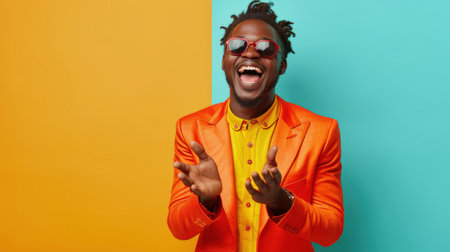 An exuberant African American man wearing stylish red sunglasses and a vibrant orange jacket laughs joyfully against a bicolor background.