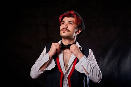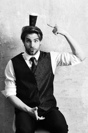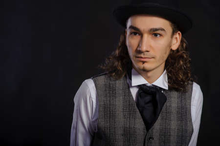 Showman. Attractive man in the cylinder. The hand gesture at the camera