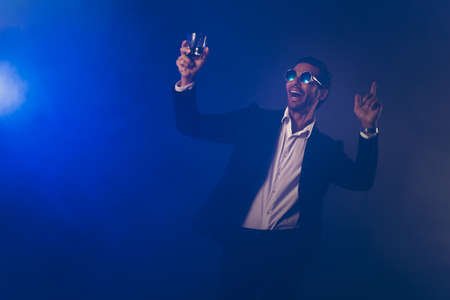 Photo of positive young man dance good mood wear sunlgass entertainer circus isolated on red color background.