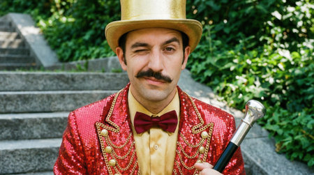 Portrait of a winking showman with a mustache wearing a red sequin jacket, bow tie, and gold top hat, holding a cane outdoors on stone steps.
