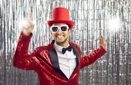 Happy ethnic man in a funny outfit has a great party idea. Excited young guy in a red sequin jacket, tophat and glasses points his index finger up and smiling standing on silver foil fringe background
