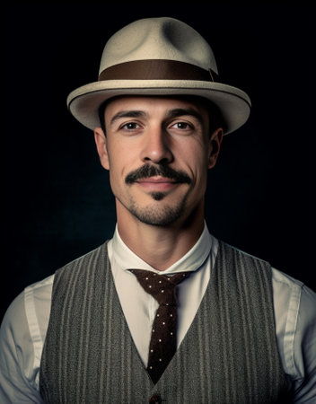 Charming gangster Handsome young man in suspenders adjusting his hat and looking at camera with smile while standing against grey background : Generative AI