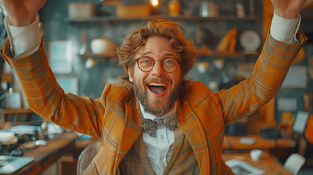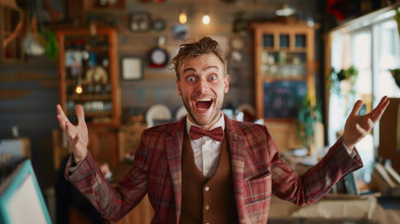 Joyful man in plaid suit expressing excitement indoors with warm lighting.