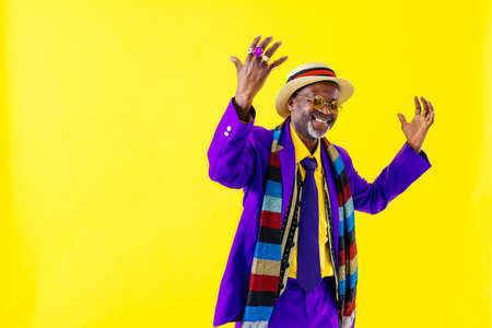 Fashionable grandfather posing with funny clothes. Senior man portraits on colored background