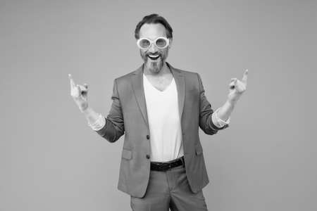 Summer office style. Vacation spirit. Summer vacation and fashion. Happy man in party glasses. Office party. Office fun. Birthday party. Cheerful happy emotional mature man. Smiling hipster