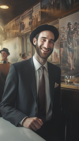 A man wearing a classic striped suit stands confidently at a bar, smiling warmly as he welcomes guests in a vintage atmosphere lit by warm lights.