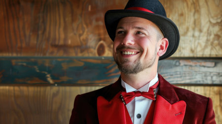 Smiling Caucasian man in red suit and top hat