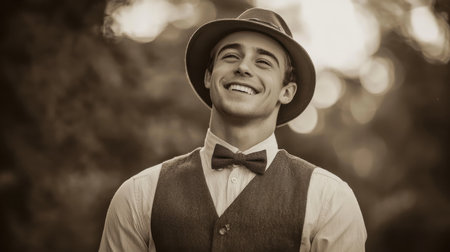 This young man, dressed in a classic vintage outfit, beams with happiness as he stands amidst a scenic outdoor background during the warm light of golden hour.