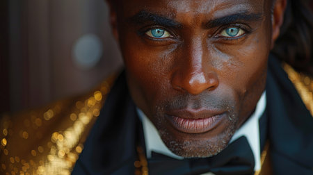 A close-up portrait captures the powerful and captivating presence of a well-dressed African American man with an intense and confident gaze.