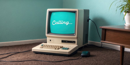Connection Ritual A vibrant teal screen with simple text commands shows Calling... in a retro font. The modem hums and chirps rhythmically adding to the nostalgic ambiance as a.