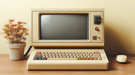 Vintage personal computer with keyboard on a desktop, outdated electronics concept