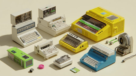 This vibrant image features a captivating arrangement of vintage typewriters and early computer equipment, blending nostalgia with artistic flair and retro charm.