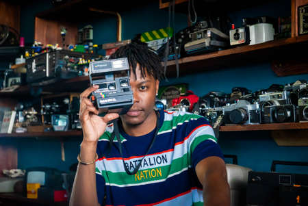 Portrait of a handsome african american man holding a camera