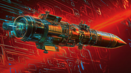 A visually striking depiction of a futuristic rocket surrounded by a vibrant abstract red background, showcasing advanced technology and dynamic energy effects.