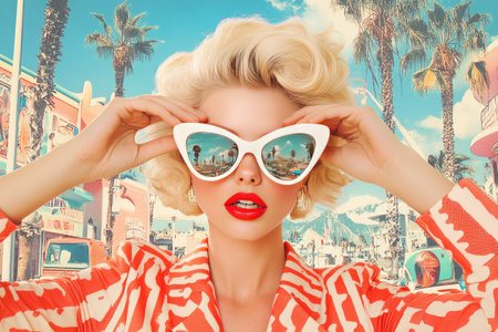 A fashionable woman is holding her oversized sunglasses in front of her face, showcasing a colorful background filled with palm trees and city architecture under a bright blue sky.