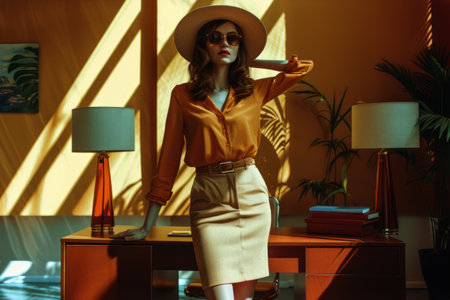 Stylized portrait of a woman channeling classic Hollywood glamor, bathed in warm ambient lighting