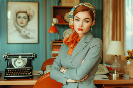 A vintage businesswoman in a suit and scarf is standing in front of a desk. She appears confident and professional in her atmosphere.