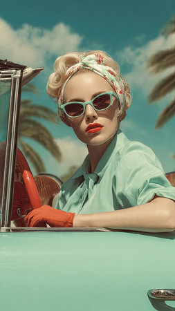Retro fashion portrait of beautiful pinup girl in retro car.