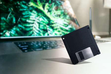 Old tech Floppy disk placed on Modern laptop (Ready with clipping path)