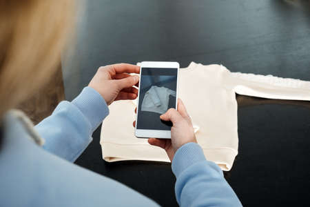 Close up of hand holding mobile phone making photos of cocktail dress.