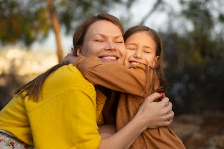 Mother and daughter hugging in the middle of the field on a sunny day afternoon. Family portrait.
