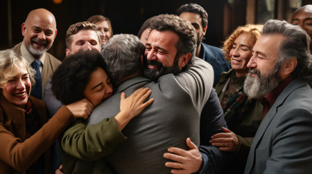 Positive people hug giving support to friends at group therapy meeting. Family members embrace gathering for holiday event at home. True emotions of bonding after collective psychotherapy