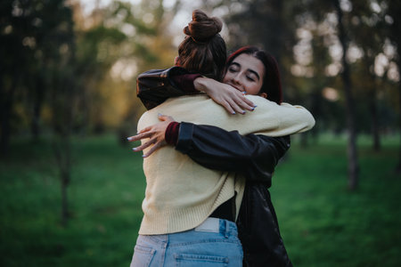 Two friends joyfully hugging in an outdoor nature park setting