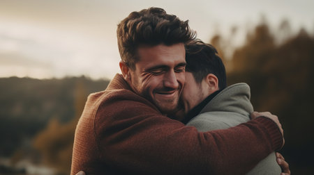 Two male friends are hugging with joy after meeting again at a park during a beautiful autumn day
