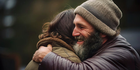 Two homeless people hug each other. Feeling of support, gratitude of community